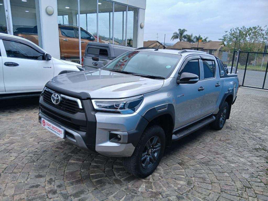 2021 Toyota Hilux 2.4GD-6 Double Cab Raider Auto in silver with full service history and balance of warranty for extra peace of mind. The proven 2.4 turbo diesel engine delivers 110 kW and 400 Nm through a smooth automatic gearbox, giving strong pulling power with an average consumption of just 7.3 l/100 km and an impressive range of up to 1 096 km from the 80 litre tank. Front mounted i4 diesel, 170 km/h top speed and 192 g/km CO2 make it a practical, efficient work and family bakkie.